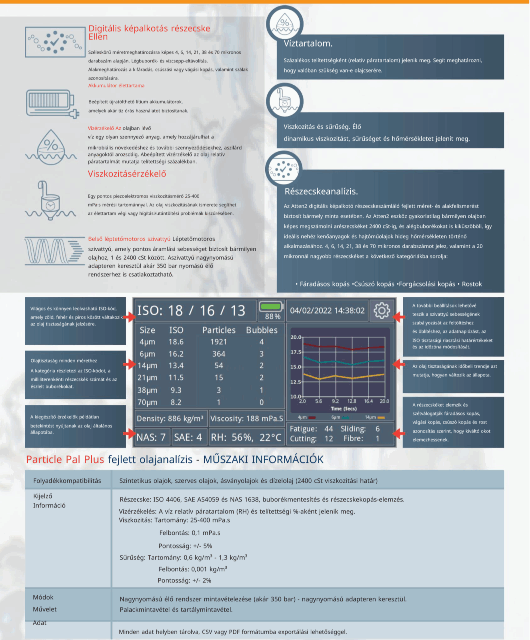 Az új Particle Pal Plus sorozatunkba a legújabb részecskeszámlálási technológiát, valamint egy viszkozitás- és sűrűségérzékelőt építettünk be. ISO 4406 szerinti darabszámot, valamint 4, 6, 14, 21, 38 és 70 mikronos méretmeghatározást és buborékkiküszöbölést biztosít. A digitális képalkotás, fejlett algoritmusokkal kombinálva, a részecskéket fáradásos kopás, vágási kopás és csúszó kopás kategóriákba sorolja, hogy kiváltó okot elemezze. A viszkozitásérzékelő élő dinamikus értékeket ad. Ez a nagy teljesítményű technológia egy további, a víztartalmat mérő érzékelővel párosítva példátlan, helyszíni betekintést nyújt az olaj állapotába.
